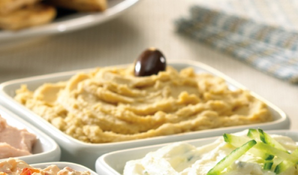 A purée of freshly prepared garbanzo beans and tahini enhanced with a hint of garlic, fresh lemon juice and extra virgin olive oil. Served with a grilled whole wheat pita.