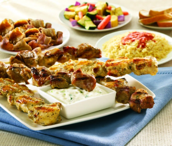 4 souvlaki sticks (chicken or pork), 6 oz. of gyro, choice of 1 large side (choice of MR. GREEK Rice, potatoes or french fries), 1 large Signature Greek Salad or large roasted seasonal vegetables & 2 mini baklava. Includes 6 oz. of tzatziki & 4 slices of fresh Vienna bread.